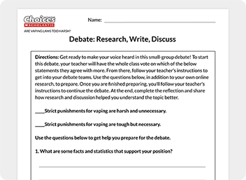 Class DiscussionsGet students talking with debate skills sheets on timely, teen-interest topics.