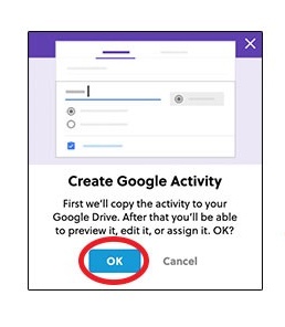 Hover your mouse over the activity you’d like to share and click Google. Choose the level of the activity (if multiple levels are available) and then click Open. You’ll get a popup asking you to confirm that you’d like to copy the activity. Click Okay and it’ll be copied to your Google Drive.